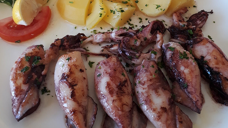 CalamarisZubereitung: Calamares putzen. Kopf und Körper-hülle voneinander durch leichtes ziehen voneinander trennen. „Rücken-gräte“ entfernen, Füße von Kopf in Augenhöhe trennen, Körperhülle mit Löffel von Innereien befreien, danach alles in kaltem Wasser spülen und zum Abtropfen in ein Sieb geben. !TIP: Körperhüllen mit der Öffnung nach unten, damit Restwasser gut ablaufen kann. Jetzt Rotweinflasche öffnen und prüfen ob der Wein gut ist. Prost! Gemüse putzen und in kleine Würfel schneiden. Auch die eine Kartoffel! Nun sollten die Calamares abgetropft sein. Den Saft von einer ½ Zitrone darüber träufeln. !TIP: eine Schüssel unter das Sieb stellen und den übrigen Zitronensaft auffangen und mehrmals darüber geben! Die anderen Kartoffeln jetzt schälen und in einen Topf mit Wasser geben, aber noch kein Salz dazu. Prüfen ob der Wein jetzt die richtige Temperatur hat. Prost! Calamares mit Pfeffer (wenn geht frisch aus der Mühle gemahlen) würzen, nicht mehr mit Zitronensaft übergießen, sonst wird der Pfeffer ja wieder abgewaschen.