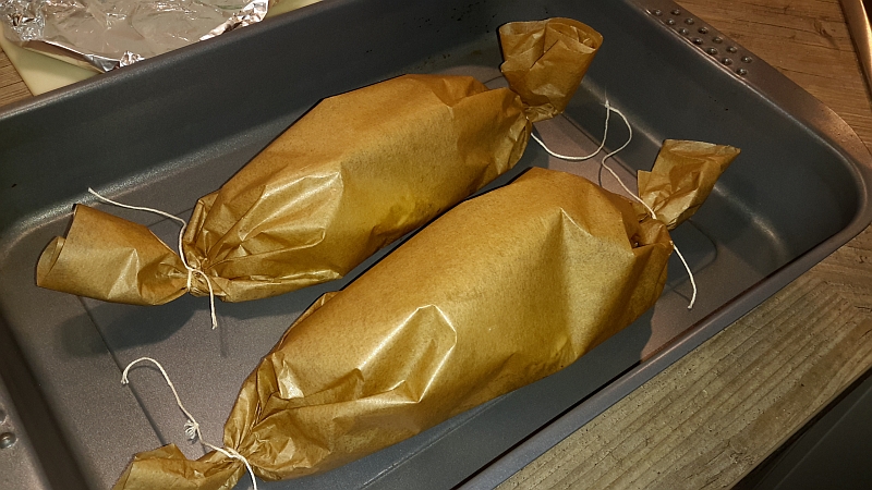 Wie, Fisch aus der Tüte? wie geht das denn? Eigentlich ist es ganz einfach. Der Fisch wird auf einem Gemüsebeet in Backpapier gewickelt und gegart. Das ist alles! Es brennt nichts an und nichts über. Und, es ist recht schnell zubereitet. Können vielleicht sogar Männer, wenn sie sich etwas Mühe dabei geben :). Zuerst mal der Einkaufszettel: Wir brauchen neben den Gewürzen, wie: Salz, Pfeffer, etwas Thymian und vielleicht einen Zweig Rosmarin; was in einem guten Haushalt vielleicht sogar vorhanden ist noch etwas. Ja, den Fisch! Und Welchen? Ich schlage mal vor: Kabeljau- (Skrei!), Steinbeißer-, Zander-, oder auch Steinköhler-Filet, besonders einet sich Schwarzer-Heilbut, ca. 180-200 Gr. pro Person sollten es schon sein, eine Fenchelknolle mittelgroß, eine kleine Zucchini, eine Zitrone naturrein und Fenchelsamen, der sicher nicht zur Standardausstattung zuhause gehört. Dann noch Backpapier, also nachschauen ob noch welches da ist. Und nicht vergessen ein Baguette und ein guter Weißwein, kellerkalt, wäre nicht schlecht dazu.