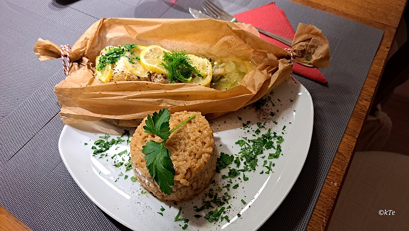 ![]() Fischfilet ![]() Fisch in der Tüte ![]() Fischtüte angerichtet ![]() Fischtüte mt Risotto |