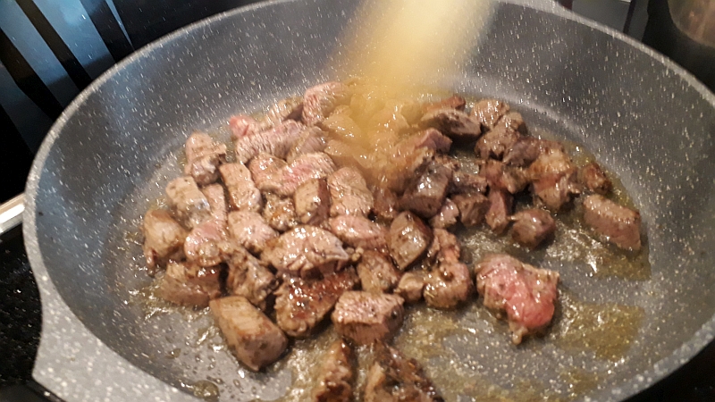 Zuerst das Filett in ca. 1 x 3 cm Stücke schneiden. Die Eschalott grob hacken, Gewürzgurke in Stifte oder Scheiben schneiden, Champignon in Scheiben schneiden und die Rinderbrühe in heißem Wasser anrühren. Nudeln abwiege und einem großen Topf mit Salzwasser bereitszellen.