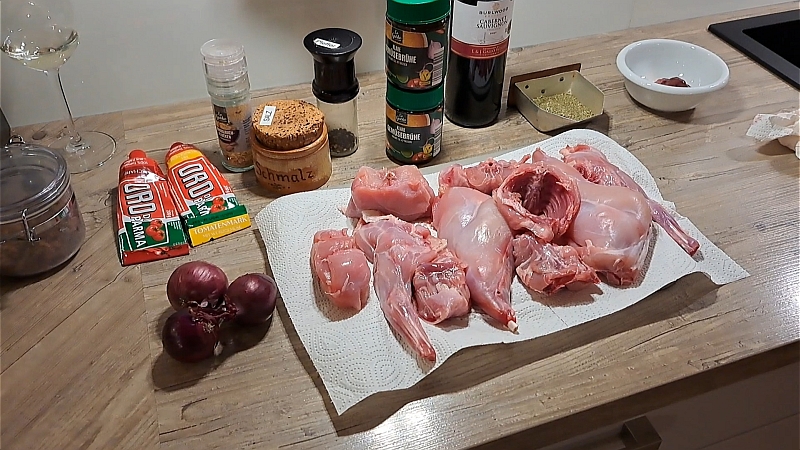 Es ist gar nicht so kompliziert wie es im ersten Moment aussieht. Das Kaninchen gibt es schon küchenfertig im Supermarkt. oder beim Metzger des Vertrauens zu kaufen. Das Zerlegen ist recht unproblematisch: zuerst die Vorder- und Hinterräder, ich meine natütlich die Vorder- und Hinterbeine abtrennen. Dann den Rumpf in etwa 3-Finger breite "Scheiben" schneidden. Und schon kann es losgehen. Dazu schmecken Salzkartoffeln oder ein frisches Baguette. Zubereitungszeit 80-90 Minuten, davon 15 Minuten Vorbereitung und 60-70 Minuten Garzeit. Jetzt aber mal im Detail! Das küchenfertige Kaninchen unter kaltem Wasser gründlich waschen und mit Küchenkrepp abtrocknen. Das Kaninchen rundherum mit Pfeffer und Salz einreiben, die Keulen und Vorderläufe abtrennen und den Rücken in 6 Stücke schneiden. Den Speck in kleine Würfel schneiden und ebenso wie das Öl in den Bratentopf geben. Bei starker Wärmezufuhr den Speck glasig ausbraten. Dann die Kaninchenteile in den Topf geben und 10-15 Minuten anbraten. Danach wieder aus dem Topf nehmen. In der Zwischenzeit die Knoblauchzehen schälen, zerdrücken und zusammen mit den Gewürzen in den Topf geben. Die Zwiebeln, die Möhren und den Sellerie schälen, kalt waschen und abtropfen lassen. In etwa 2 cm große Stücke schneiden und in den Topf geben. 10 Minuten unter Rühren bei starker Wärmezufuhr anbraten. Jetzt wieder die Kaninchenteile hinzugeben. Dann das Tomatenmark, die Fleischbrühe und die Hälfte des Rotweins dazugießen. Aufkochen lassen, den Topf schließen und den Herd auf kleine Wärmestufe zurückschalten. Das Wildkaninchen in weiteren 30-45 Minuten gar schmoren. Bei Bedarf zwischendurch etwas Rotwein nachgießen. Die Creme fraiche (oder süße Sahne) unterrühren und das Gericht mit frisch gemahlenem Pfeffer und eventuell etwas Salz abschmecken. In einer Schüssel zu Tisch geben. Arbeitsgeräte: Schneidbrett, Messer Durchschlag, Bratentopf mit Deckel, Rührlöffel. Dosenöffner