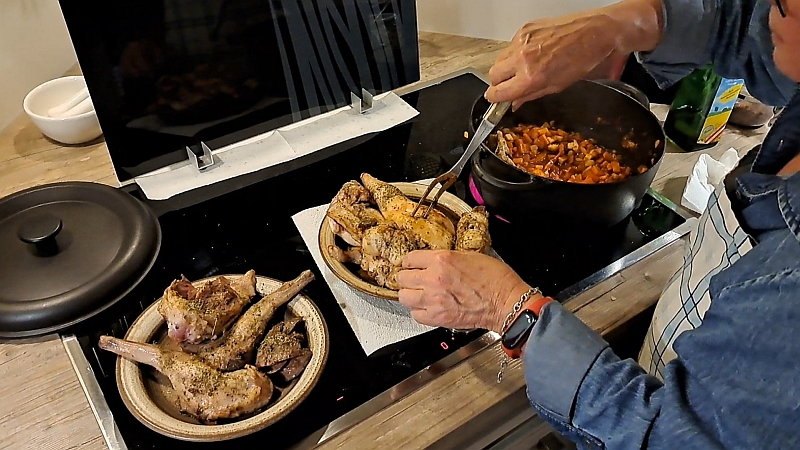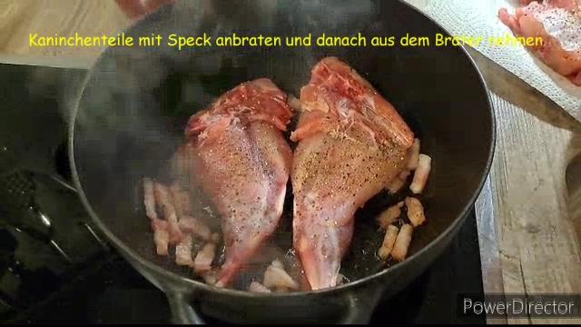 ![]() Alles ist vorbereitet ![]() Es geht los, Speck anbraten ![]() Kaninchenteile anbraten ![]() Die angebratenen Kaninchenteile zum Gemüse ![]() Die Soße wird vorbereitet ![]() Vielleicht noch etwas abschmecken ... ![]() |