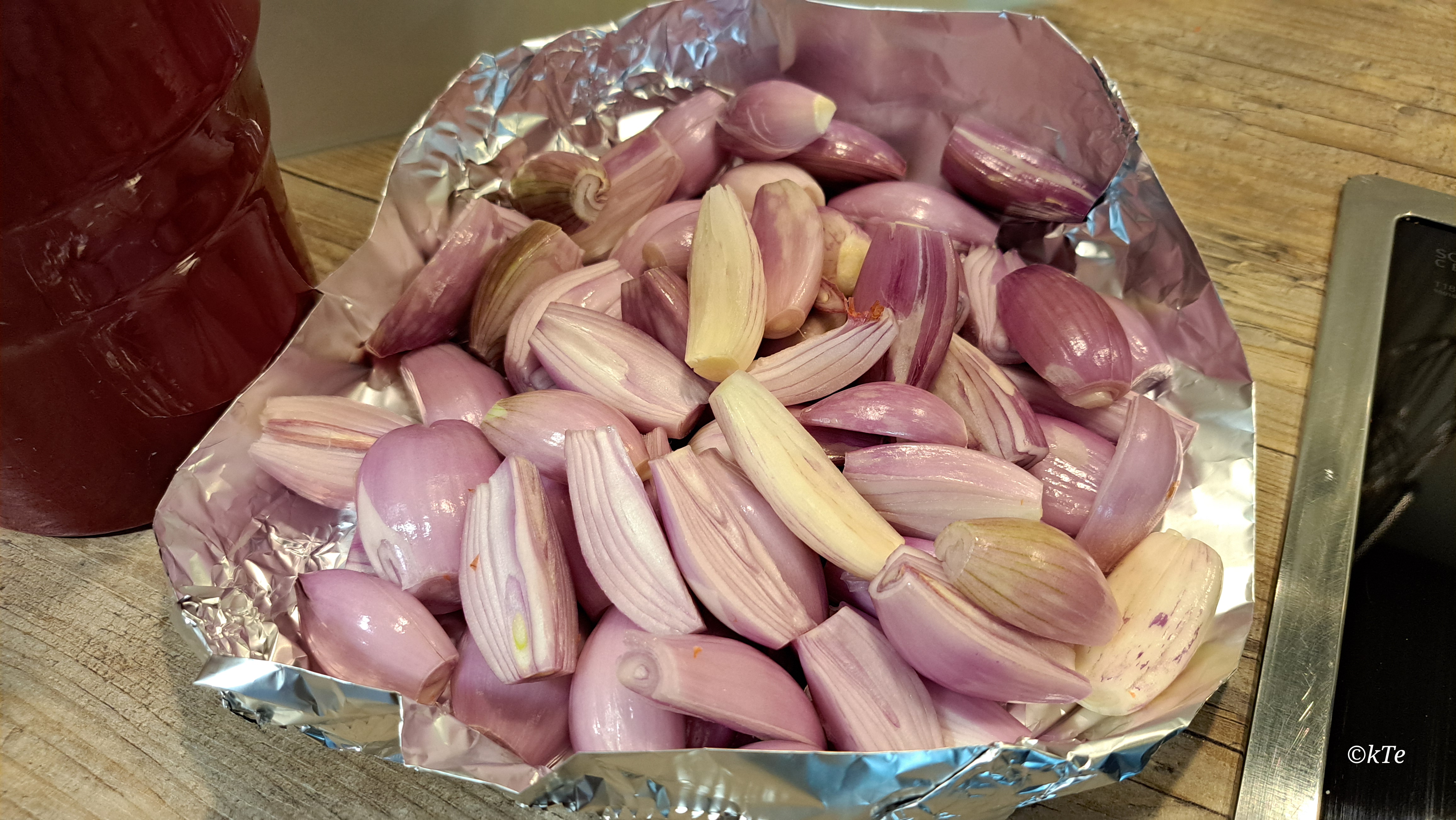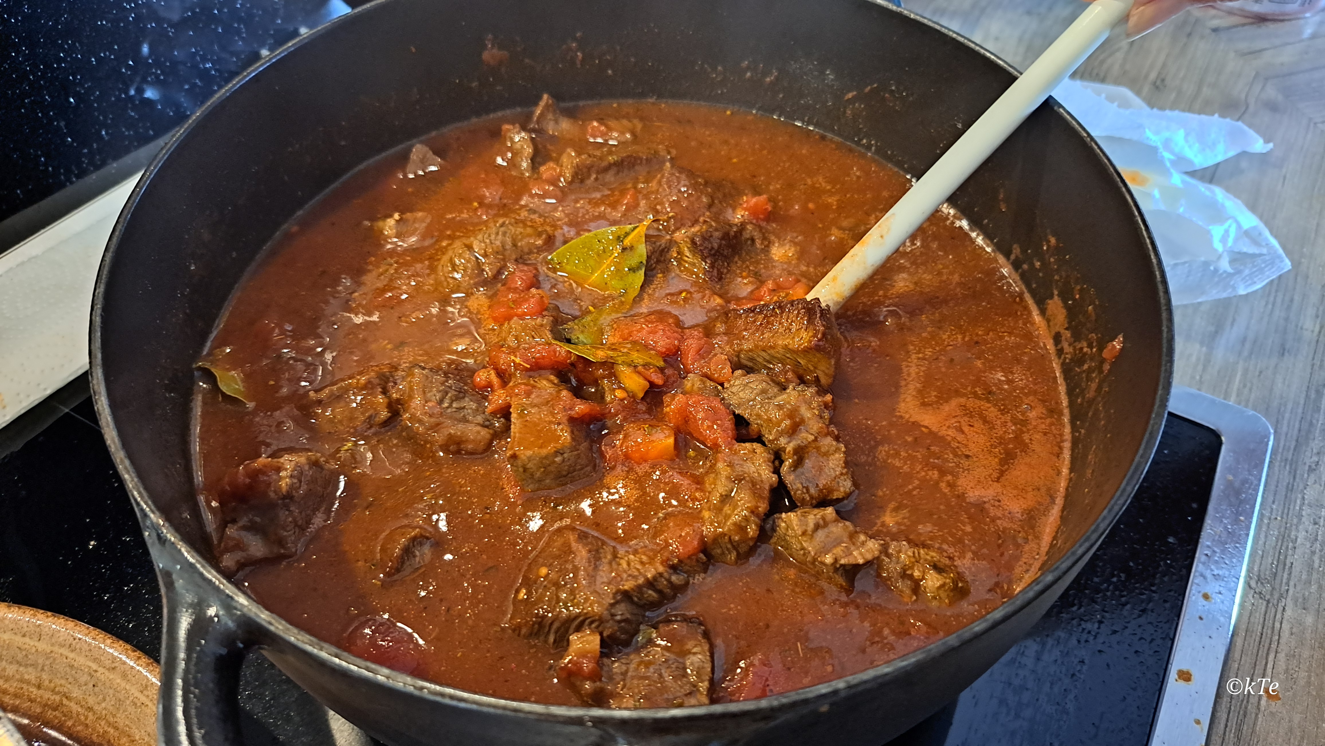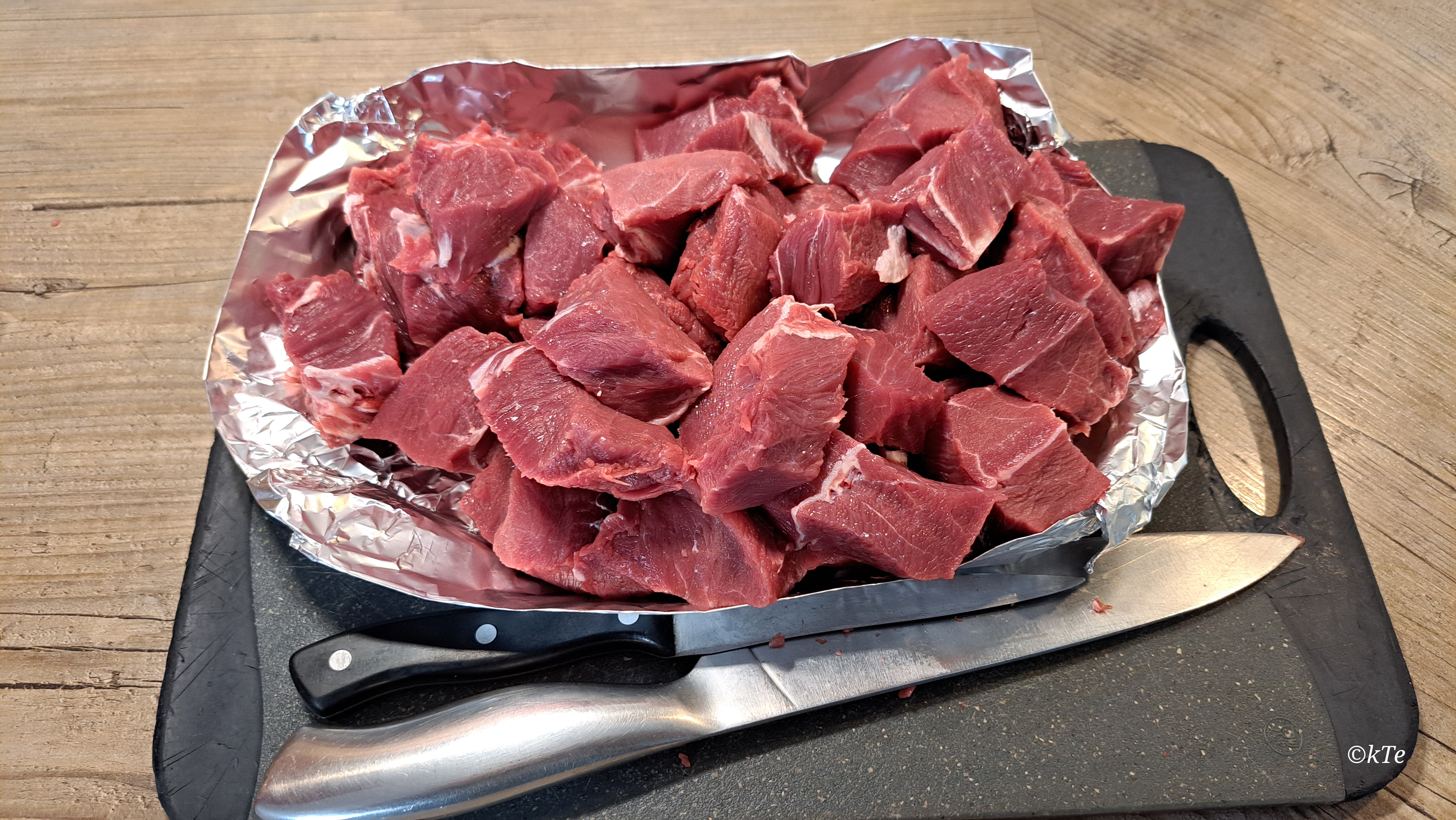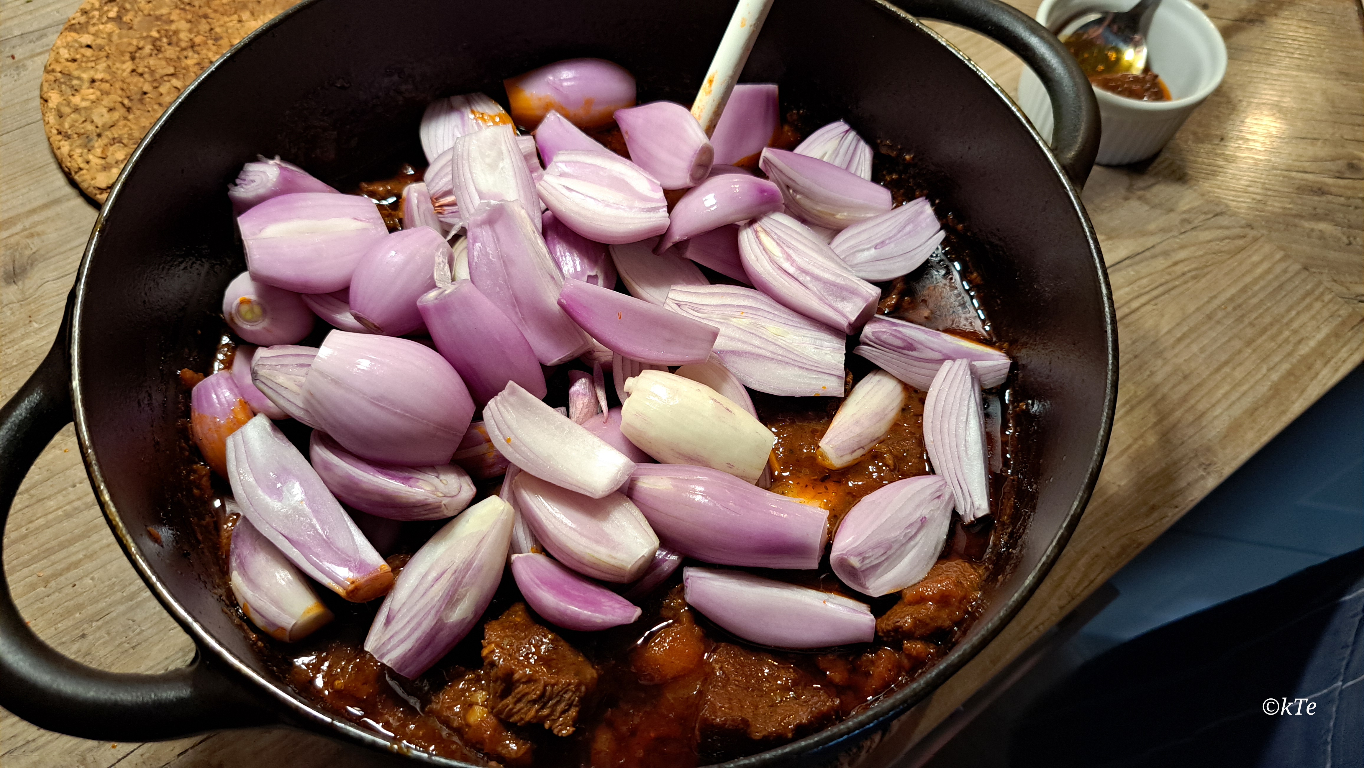 Es ist gar nicht so kompliziert wie es im ersten Moment scheint, wenn alle Zutaten bereitstehen. Und schon kann es losgehen. Als Fleisch eignet sich ein Stück aus der Keule, Nuß Ober-/Unterschale, Keule oder Wade. Der Metzger ihres Vertrauens wird sie sicher beim Einkauf gerne beraten. Zuerst das Fleisch würfeln (größer als für normalen Gulasch) und portionsweise scharf anbraten. Die Fleischstücke danach aus dem Bräter nehmen und bereitstellen. Gehackte Tomaten, kleingeschnittenen Knoblauch und alle anderen Zutaten OHNE die E-Schalott!!" zugeben und zugedeckt im Backofen bei 180°C Umluft gut 2 Std schmoren. Wenn das Fleisch fast gar ist, die E-Schalott zugeben. das ist etwa 1/2 Std vor Ende der Kochzeit. Vielleicht zum Schluß noch etwas abschmecken und von den o.g. Gewürzen oder Wein verwenden. Dazu schmecken Salzkartoffeln oder ein frisches Baguette oder wie das griechesche Original mit Zaziki und griechischen Nudeln (Kritharaki ) sevieren. Zubereitungszeit 120 Minuten, davon 15 Minuten Vorbereitung und 90 Minuten Garzeit. Arbeitsgeräte: Schneidbrett, Messer, Bratentopf mit Deckel, Rührlöffel, Dosenöffner