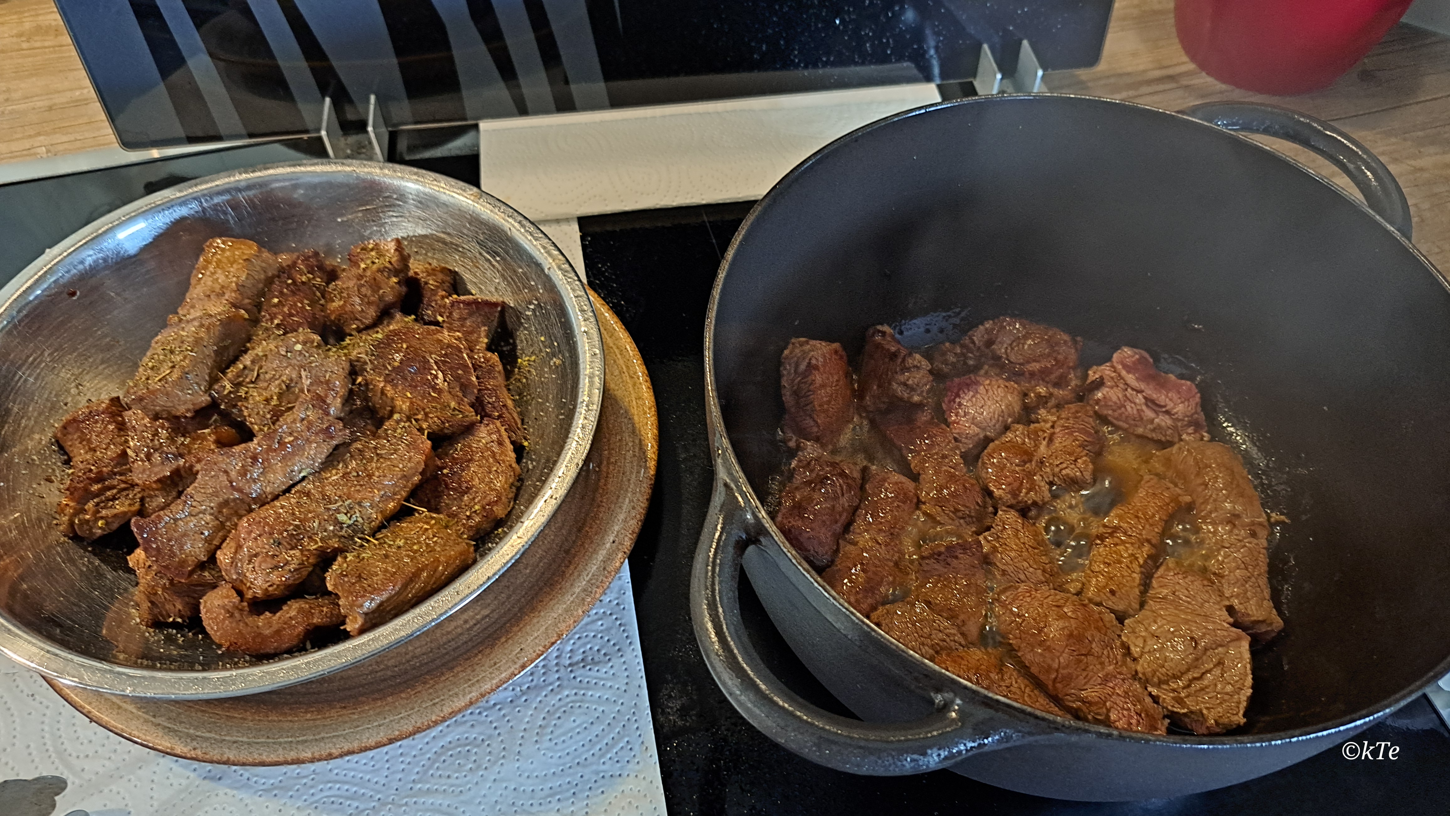 ![]() Alles ist vorbereitet ![]() Gulaschstücke in großen Teilen ![]() Fleisch anbraten und aus dem Topf nehmen ![]() und ab in den Backofen damite ![]() E-Schalott vorbereiten ![]() 1/2 Std vor Ende der Garzeit E-Schalott zugeben ![]() Nach ca 2 1/2 Std im Backofen, FERTG! |