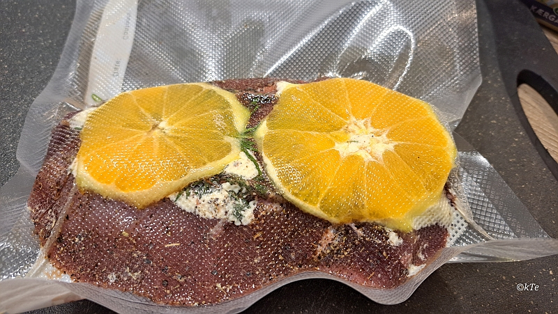 Zuerst kommt die Entenbrust in den Vakuumbeutel. Dazu kommen je ein Thymian- und ein Rosmarinzweig , zwei Orangenscheiben, zwei/drei Butterflöckchen, etwas frisch gemahlener Pfeffer und Thymian kann nicht schaden. !!NICHT SALZEN!!. Beim Sous-Vide-Garen etwas beim würzen sparen. Gewürze werden geschmacklich bei der langen Garzeit verstärkt. Alles vakuumieren, versiegeln und für 2-3 Std., ab ins 60°C vorgewärmte Wasser.