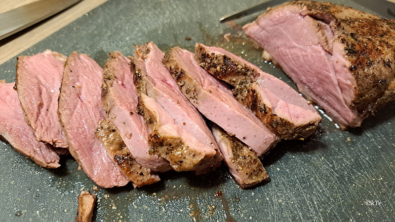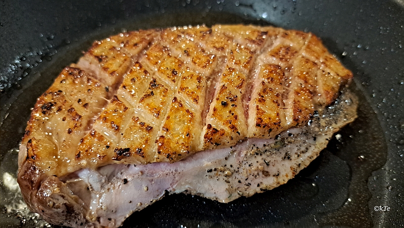 Hier mal eine andere Zubereitungsweise: Sous-Vide-Garen! Das benötigt zwar eine längere Garzeit, aber dafür darf die Entenbrust unbeobachtet die Zeit, bei 60°C, im "Wirlpool" verbringen. Je nach Dicke etwa 2-3 Std.