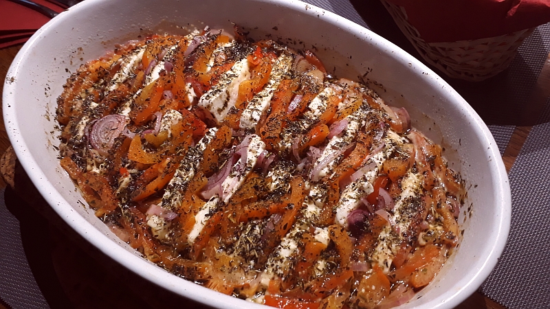 Feta, Tomaten, Paprika, Zwiebeln, eine Art Auflauf für Sommerabende |