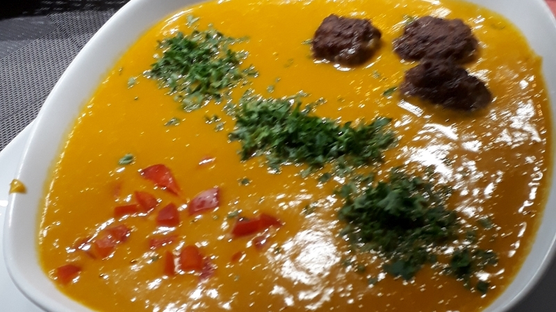 Kürbis-Ingwer-Suppe die Zweite: mit Fleischbällchen |