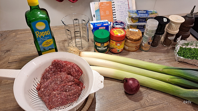 Butter oder Öl in einem großen Topf erhitzen, die Zwiebelchen glasig andünsten; dann kommt das Hackfleisch hinzu und krümelig anbraten. Den Lauch dazu geben, kurz anbraten und danach mit der Gemüsebrühe ablöschen. Etwa 10 Min köcheln lassen.