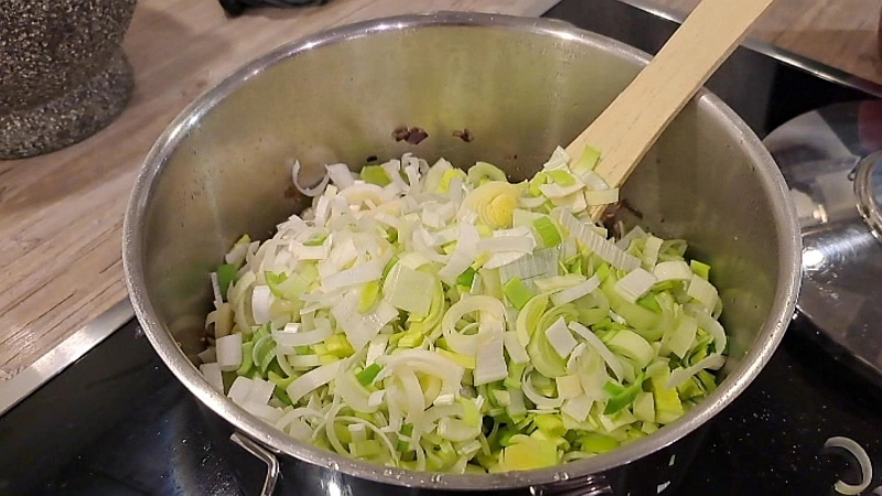 Zuerst den Lauch halbieren, waschen und in schmale Scheiben schneiden. Die Zwiebel in kleine Würfel hacken.