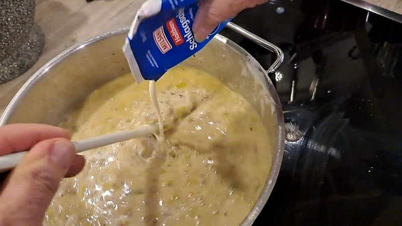 Sahne-Schmelzkäse einrühren und kurz aufkochen lassen und zum Ende etwas Sahne unterrühren.