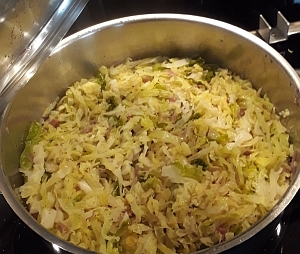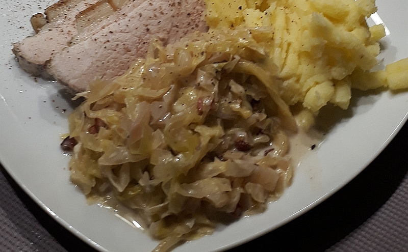 Zubereitung (ca. 40 Min): Den Kohl putzen, waschen, abtropfen, längs vierteln und den Strunk herausschneiden. Dann in ca. 5 mm breite Steifen schneiden. Den Speck (Dörrfleisch) in 5 mm Würfel schneiden. Die Zwiebeln schälen und fein hacken. Die Speckwürfel in einem Topf leicht anbraten, die Zwiebeln zugeben und mit etwas Butter glasig braten. Jetzt den Kohl und die Gewürze zugeben kurz anschmoren lassen, den Weißwein zugeben und ungefähr 30 Min. düsten. Der Kohl sollte ruhig noch etwas Biss haben. Sahne (Kochsahne) untermischen und noch 5 Min. auf kleiner Stufe köcheln lassen, abschmecken und servieren. Und wenn noch etwas übrig bleibt, geht gewärmt noch am nächsten Tag! |