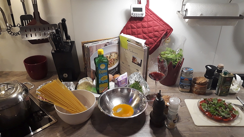 Ein 30 Minutenrezept! Das geht nicht nur ratz-fatz, sondern es schmeckt auch noch lecker! Wir benötigen an Handwerkszeug folgende Sachen: Wie eigentlich immer in der Küche ein sehr scharfes Messer, einen großen, hohen Kochtopf für die Spagetti, eine große Bratpfanne eine mittelgroße Schüssel für die Eier-, Parmesan- Sahnemischung evtl. eine Küchenwaage eine Schneideunterlage und allgemeines Küchenwerkzeug ...