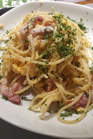 Vorbereitung (ca. 10-15 Min): In einem hohen, großen Topf Wasser zum Kochen bringen 1-2 Tl Salz zugeben und die Spagetti kochen. Dauer siehe Packung, aber trotzdem kosten, weil die Angaben meist nicht stimmen). Petersilie fein hacken. Dörrfleisch in kleine Streifen schneiden. Den Parmesan reiben. 2 Eier und ein Eigelb in eine Schüssel geben und mit der Sahne vermischen. Nicht schaumig schlagen! mit Salz und Pfeffer würzen, den geriebenen Parmesan untermischen. Kochzeit (ca. 10-15 Min): In der Pfanne das kleingeschnittene Dörrfleisch (Speck) mit etwas Öl leicht anbraten. Die gegarten Spagetti tropfnaß dazugeben, kurz durchmischen, von der Kochplatte nehmen und die Eier-/Parmesan-/Sahnemischung darübergeben. Sofort durchmischen! Wir wollen ja kein Omelett backen; sondern die Eier-/Parmesan-/Sahnemischung soll sich an den Spagetti festhalten. Den gehackten Petersilie als Garnierung darübersteuen. Fertig! |
