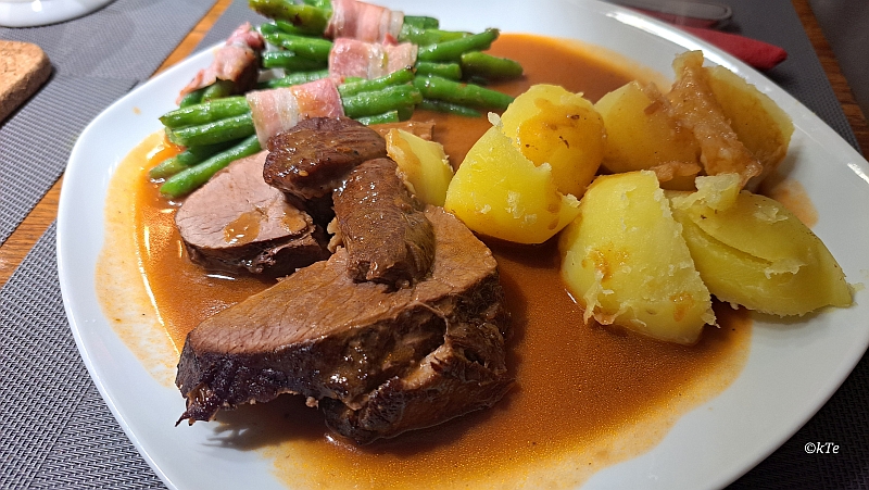 Lammkeule mit Speckbohnen und Salzkartoffeln