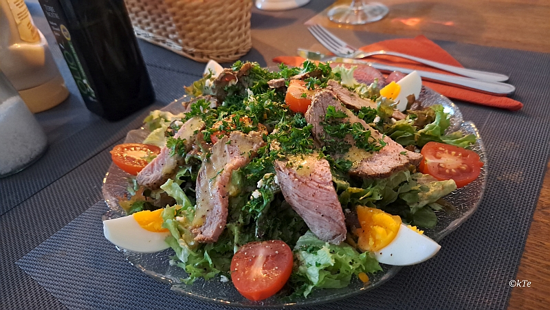 Eichblattsalat mit Roastbeefstreifen und gekochten Eiern mit Zitronen-Senfdressing