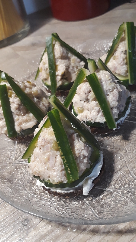 Auf eine Scheibe Pumpernickel etwas Philadelphia Frischkäse streichen. Darauf eine dünne Scheibe Salatgurke.