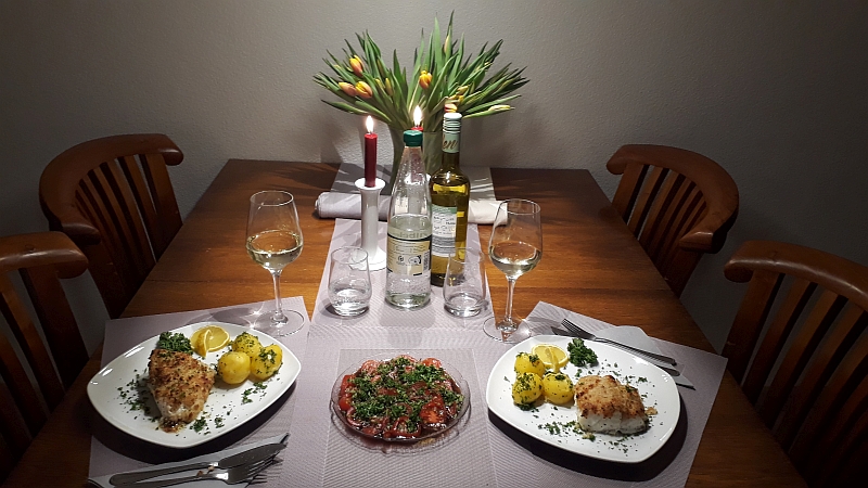 Vorbereitung (ca. 15-20 Min): Kartoffeln schälen und in einen Topf mit kaltem Wasser geben. Die Schalotten putzen, fein würfeln und in einer Pfanne mit etwas Öl glasig andünsten. Danach abkühlen lasen. Petersilie hacken. Den Fisch kalt abspülen, abtrocknen und wenn er am Stück ist, in Portionen schneiden. Im gegartem Zustand geht das nicht mehr, da das Filet sonst zerbröselt. die Auflaufform mit etwas Butter ausstreichen. Für die Kruste Thymianblättchen fein hacken. Zitronenzisten, etwa 1 Tl., mit dem Parmesan, Panko und den gedünsteten Schalotten vermischen, leicht mit Pfeffer und Salz würzen und mit der Butter verkneten und ein bisschen Zitronensaft zugeben. Die Fischfilets mit der Haut nach unten in die Auflaufform legen mit Pfeffer, Salz würzen, etwas Saft von der Zitrone darüber träufeln und die Bröselkruste darauf verteilen, dabei leicht andrücken. Teller warmstellen! Wenn ich nichts vergessen habe, kann es nun Losgehen. Kochzeit (ca. 20 Min): Jetzt ist es Zeit den Tisch zu decken und vielleicht noch einen Salat anzurichten. Wenn die Kartoffeln gar sind, Heizplatte !!!abschalten!!!das Wasser abgiesen, und zum Abdampfen zurück auf die noch warme Herdplatte stellen. Etwas Butter zugeben und schmelzen lassen. Dann den gehackten Petersilie darüber streuen und den Topf schwenken. Dazu paßt ganz gut ein weißer Burgunder. GUTEN APPETIT! |
