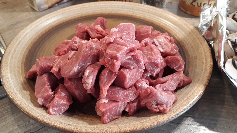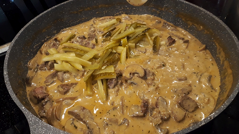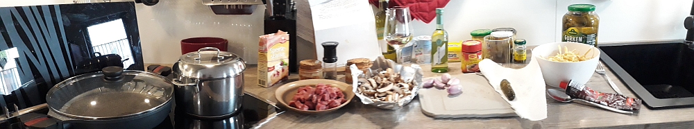 Vorbereitung (ca. 10-15 Min): Zuerst das Filett in ca. 1 x 3 cm Stücke schneiden. Die Eschalott grob hacken, Gewürzgurke in Stifte oder Scheiben schneiden, Champignon in Scheiben schneiden und die Rinderbrühe in heißem Wasser anrühren. Nudeln abwiege und einem großen Topf mit Salzwasser bereitszellen.