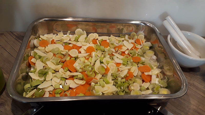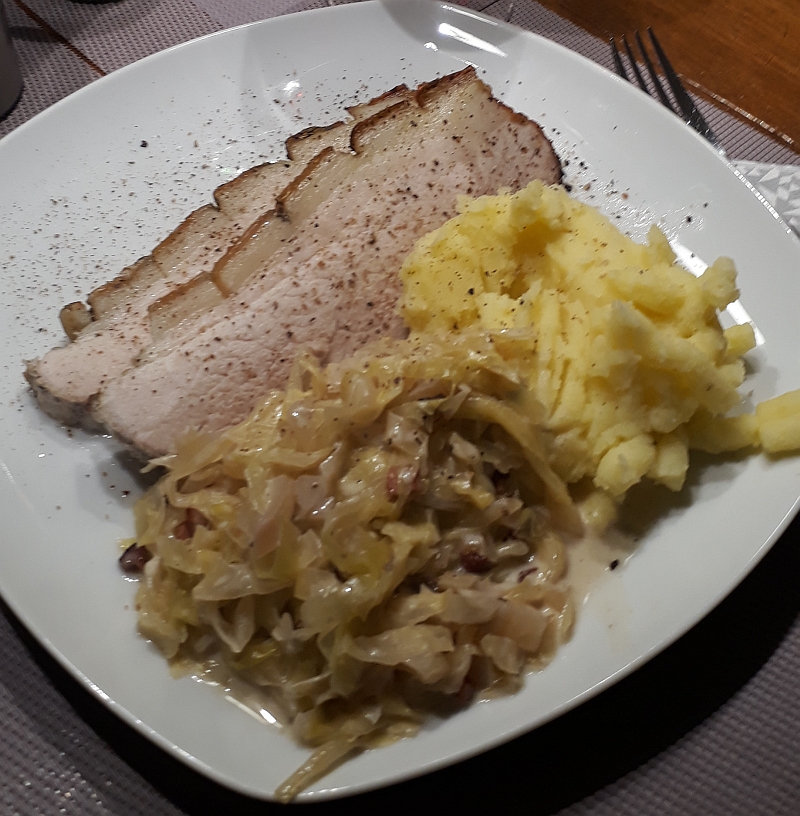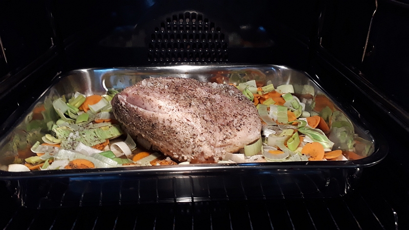 Zubereitung: Den Schweinebraten abwaschen, abtrocknen und die Fleischseite mit Salz, Thymian, geriebenem Pfeffer und Kümmel würzen. Ca. 1/2 Liter Gemüsebrühe anmischen, mit den Wacholderbeeren in die Pfanne geben und erhitzen. Dann den Schweinebraten mit der Schwartenseite hineinlegen. Die Brühe sollte nur die Schwarte und vielleicht ein bisschen der Fettschicht erreichen, denn es soll ja nur die Schwarte weich werden, damit wir sie mit einem scharfen Messer leichter einschneiden können. Die Brühe sollte nicht kochen sondern nur sieden. Den Backofen auf 150 Grad Ober/Unterhitze vorheizen. Nach etwa 20-30 Min. kann der Braten dann auf einem Küchenbrett auf der Schwartenseite eingeschnitten werden. Der Abstand zwischen den Einschnitten wählt man am besten so, dass sie der späteren Scheibendicke entsprechen. Wer mag, der kann auch noch quer Einschnitte machen. Jedoch nur die Schwarte und ein wenig der Fettschicht einschneiden, nicht in die magere Schicht. Jetzt kann auch die Schwartenseite gewürzt werden. Alles gut in die Schnittkerben einreiben. Das Gemüse kleinschneiden, in die Auflaufform geben und die Brühe aus der Pfanne mit dazugeben. Den Braten mit der Schwartenseite hineinlegen und für ca. 90 Min. (variert je nach der grösse des Bratens) in den Backofen, mittlere Schiebeleiste, geben. wenn nötig, immer wieder mal etwas Flüssigkeit nachfüllen damit der Braten nicht trockenliegt. Wer ein Bratentermometer hat ist jetzt im Vorteil. Hat die Kernthemperatur ungefähr 65 Grad erreicht, kann der Braten umgedreht werden. Jetzt wird die Kruste erstellt. Grill auf 250 Grad einschalten und bitte den Braten nicht aus dem Auge lassen, damit die Kruste nicht verbrennt. Die Bildung einer knackigen Kruste dauert so um die 10 Min. Dann ist auch die Kernthemperatur noch um ein paar Grad angestiegen, aber nicht mehr als auf etwa 70 Grad. Der Braten ist jetzt innen noch saftig. Übrigens! Bauch- und Nackenstücke die schön mit Fett durchzogen sind, eignen sich meiner Meinung nach besser, als magerere aus der Schulter, die meist fester im Fleisch sind. Was eignet sich am besten dazu? Wer den Krustenbraten nicht mit etwas Senf zum guten Bauernbrot essen möchte, dem empfehle ich Kartoffelstampf und Sauerkraut oder Sahne-Wirsing oder -Spitzkohl. Zum Rezept ----> Sahnespitzkohl