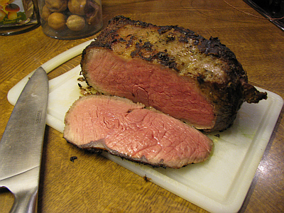 und aufschnitt, war es nicht durchgegart. Es war fast noch roh. Aber es schmeckte trotzdem gut.
