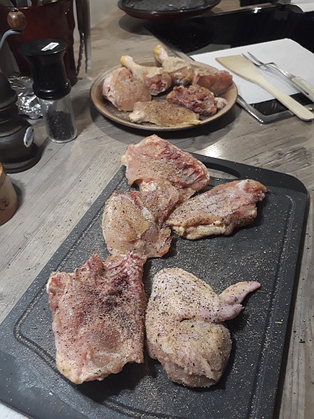 ![]() portioniertes Gickelsche ![]() Gewürze ![]() Gickelsche in den Bachofen ![]() kernlose Trauben zugeben |