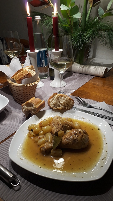 Eine kleine Geschichte: Versetzten wir uns einfach mal in eine Zeit als es noch kein Internet, Handy und so'n Zeug gab. Wo man seinen Unterhalt noch mit harter Arbeit verdiente. Ein Tag im Herbst in Frankeich, im Rheingau oder in der Pfalz? Egal. Es ist Weinlese. Alle im Bergdorf haben dazu beigetragen die Ernte, die Weinreben, einzubringen. Man hat nicht viel, man ist nicht reich, aber man ist zufrieden mit dem was man hat. Alle haben sich eingebracht und sitzen gemeinsam zusammen und freuen sich auf das Essen, das beim Bäcker im noch warmen Ofen gart. Es sind wenige Zutaten die dazu nötig waren: Huhn, E-Schalott, Weintrauben, ein paar Salbeiblätter, Thymian, Salz, Butter, Pfeffer, Wacholderbeerren, Nelken, Lorbeerblätter,Zucker und einen trockenen oder halbtrockenen Weißwein. Es ist von jedem etwas was jeder dazu beitragen konnte. Eigentlich nichts besonderes, aber etwas, aus dem was leckeres beim Bäcker im Ofen gart. Dazu gibt es Weißbrot. Alle freuen sich schon darauf, nach der schweren Arbeit im Weinberg, gemeinsam den Tag mit einem leckeren Essen zu beschließen. Und was gibt es Gutes? Die Franzosen nennen es "Coq au vin", was vielleicht nach etwas kompliziertem klingen mag. 'Huhn in Weinsauce" klingt schon etwas einfacherer. Wir, im Bergdorf, nennen es einfach "Woi-Gickelsche". Und so ist es auch, einfach und (sau)gut.