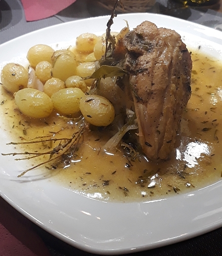 Und so wird es zubereitet: Das Baguette im Bachofen aufbacken; falls man kein frisches vom Bäcker hat. Das Gickelche wird zerteilt, mit Pfeffer, Salz, Muskat gewürzt und damit es etwas Farbe bekommt, in Butter angebraten. Dann aus dem Bräter nehmen. E-Schalott leicht anbraten, Salbei, Thymian zugeben die Gickelscherteile dazugeben und mit Wein nach und nach auffüllen, kurz aufkochen lassen. Dann die Nelken, Wacholderbeeren, die Lorbeerblätter dazu. Und mit geschlossenen Bräter bei 180°C Umluft für 45 Min ab in den Backofen. Ca. 5 Min vor Ablauf der Zeit, die Trauben in Butter und Zucker mit dem Zitronensaft und Zitronenabrieb karamellisieren und zu dem Gickelsche in den Topf. Am besten dazu passt ein Wein, in dem auch das "Gickelsche" gebadet hat. Und so wird's gemacht ! Dazu wünscht der "Flinke Löffel" aus den Bergdorf einen Guten Appetit ! |