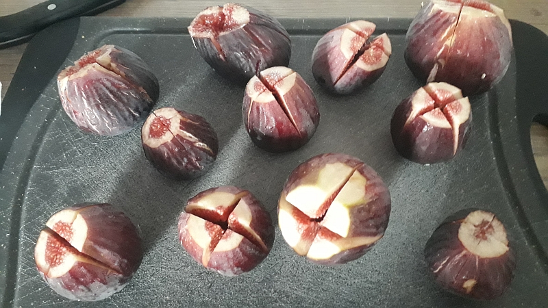 Das Stiehlende abschneiden und die Feigen kreuzweise einschneiden. Nicht durchschneiden!!
