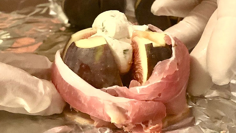 Zuerst 2 Tl Dressing in die Feigen geben. Dann etwas Frischläse mit Hilfe der Plastiktüte als Spritze, in die Feige