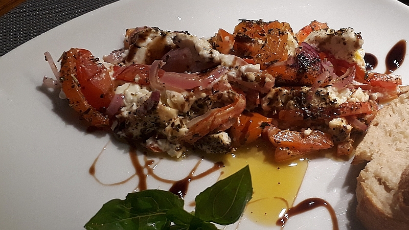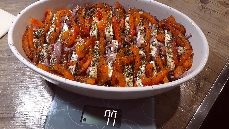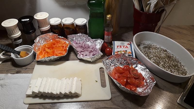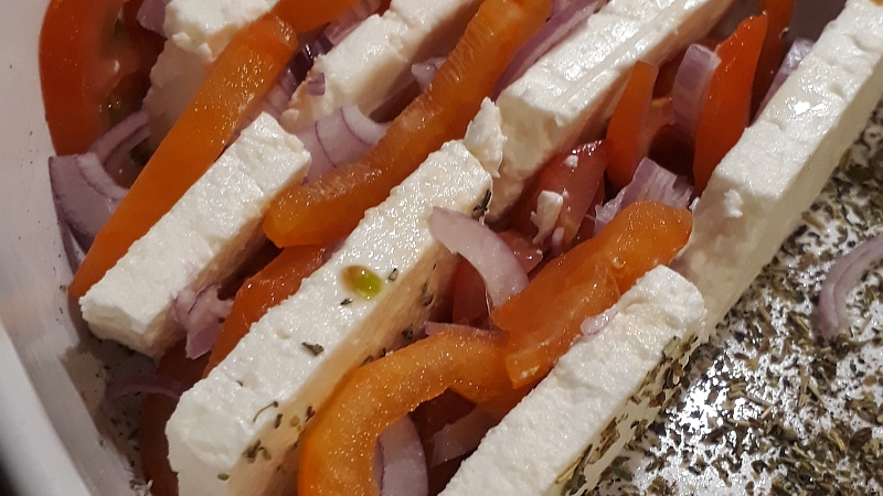 Vorbereitung (ca. 10-15 Min): Die Paprika vierteln und entweder schälen oder, was einen noch besseren Geschmack erziehlt im Backofen unter dem Grill, mit der Hautseite nach oben anrösten und dann die verbrannte Haut abziehen. Das verleiht der Paprika einen leichten karamelligen Geschmack! Die Zwiebeln halbieren und in feine Ringe schneiden. Die Tomaten halbieren und wie die Paprika und den Fetakäse in etwa 5 mm breite Scheiben schneiden. Die Auflaufform leicht einölen und den Boden schon mal reichlich mit den Kräutern bestreuen. Jetzt die Fetakäsescheiben mit Abstand nach und nach in die Auflaufforn stellen und dazwischen Paprika, Zwiebeln und Tomaten schichten. Danach alles wieder mit Kräutern bestreuen und mit Öl begießen. Aber es sollte nicht mehr als 80 gr. der Mischung aus Raps- bzw. Sonnenblumenöl, Oliven- und Sesamöl sein. Wobei das Raps- bzw. Sonnenblumenöl einen Anteil von etwa 50 gr. haben sollte. Wer es nicht so ölig mag, kann gerne auch den Ölanteil um die Hälfte verringern. Kochzeit (ca. 10-15 Min): Im vorgeheizten Backofen braucht es bei 160 Grad Umluft ca. 10 - 15 Min. in der Microwelle, was natürlich auch prima funktioniert, geht es etwas schneller. Aber habt bitte bei beidem ein Auge drauf. Es sollte schon durch und durch heiß sein, aber der Feta sollte nicht zu sehr verschmelzen. Dazu empfehle ich ein Baguette, was sich auch gut zum dippen des Öls eignet und einen kühlen Weißwein. |
