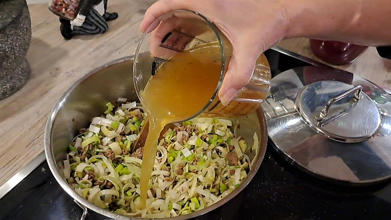 hinzu und krümelig anbraten. Den Lauch dazu geben, kurz anbraten und danach mit der Gemüsebrühe ablöschen.