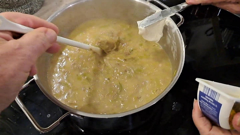 Sahne-Schmelzkäse einrühren und kurz aufkochen lassen und zum Ende etwas Sahne unterrühren.