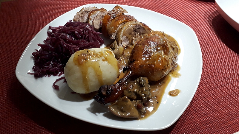 Entenbeine mit Rotkraut und Klößen