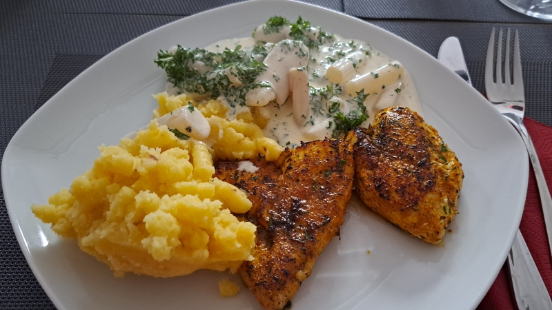 Schwarzwurzel, Käsesahnesoße, Curry-Hähnchenbrust mit Kartoffelstampf