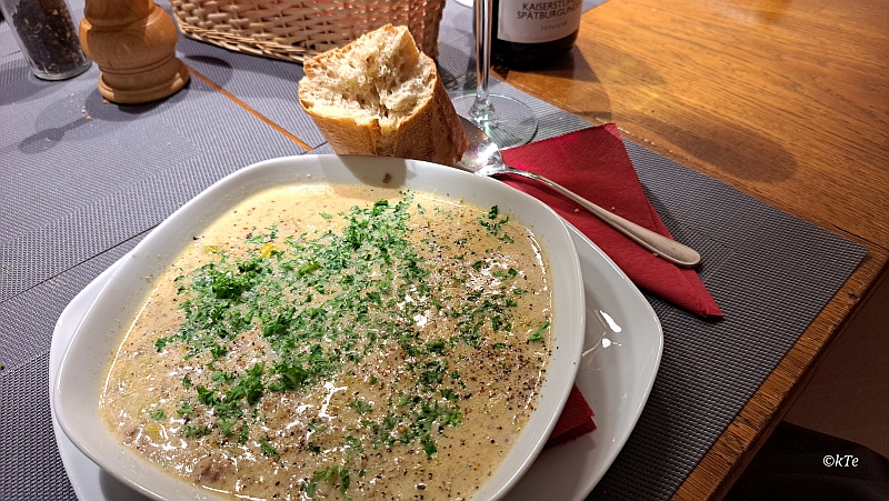 Lauchsuppe   2025/Feb./02    Sahne-Käse-Lauchsuppe mit Hackfleisch Einlage dazu Baguette