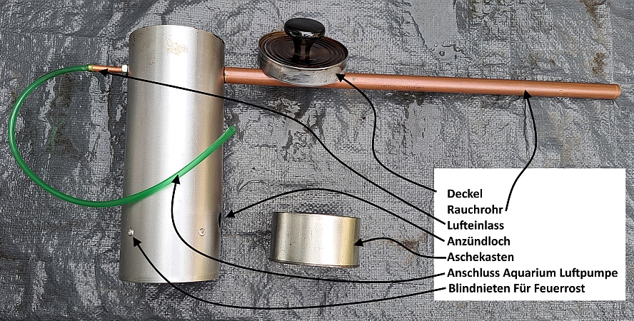 Metall!! Alles Andere kam aus der Kruschelkiste. Deckel und Aschekasten sind abgeschnittene Konservendosen.
