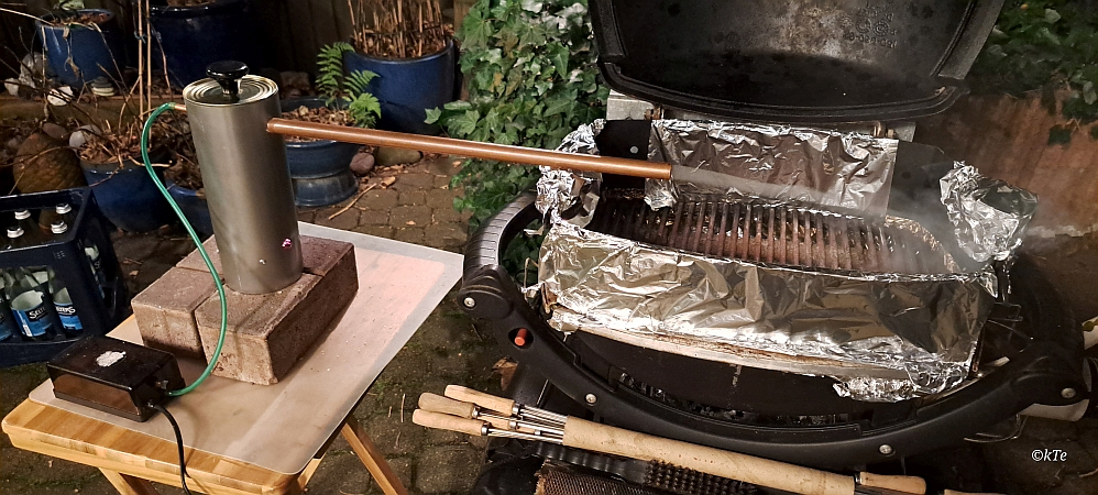 Kaltrauchgenerator in Aktion. Brenndauer mit einer Füllung ca. 2 - 2:30 Std