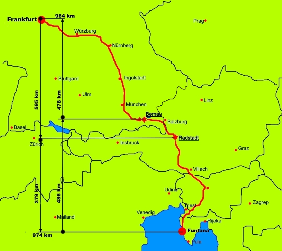 Die 974 km teilen wir uns in zwei Etappen ein. das erste Stück (595 km) mit Übernachtung in Radstadt und