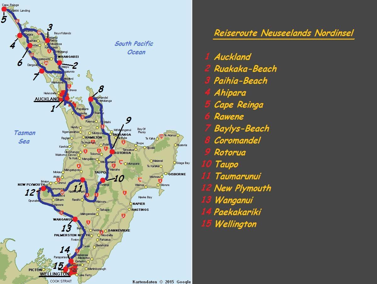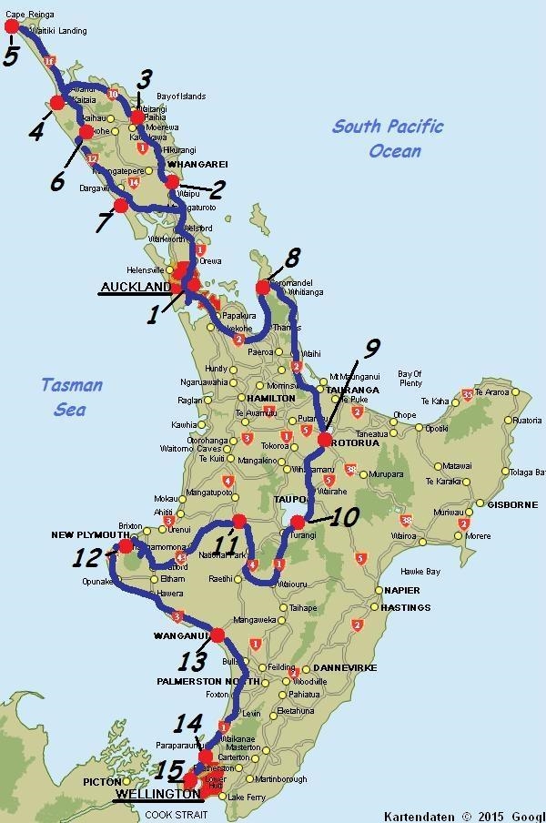 Vom Startpunkt Auckland (1) geht es entlang der Ostküste über Paihia,