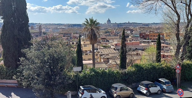 Blick von der Terrazza del Pinicio über die Stadt bis zum Petersdom, Trevi-Brunnen