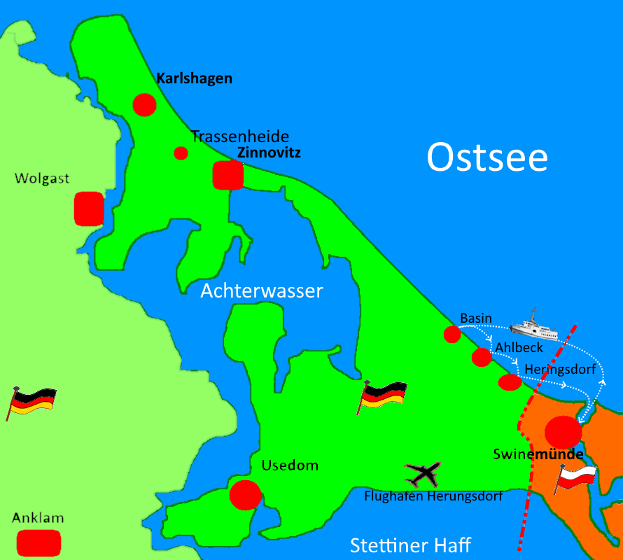 Tja, warum nicht mal zur Ostseeinsel Usedom?Nun, sie liegt nicht nur an Deutschlands Ostgrenze zu Polen und ist damit nicht gerade einfach zu erreichen; von Frankfurt aus sind es ca. 800km. Das heißt um die 8 Stunden mit dem Auto, wenn man gut durchkommt und die Zufahrt zur Insel nicht durch einen Stau die Fahrzeit wesentlich verlängert wird. Eine Alternative ist der Flieger! von Frankfurt beträgt die Flugzeit etwa 1 Std. Das hört sich nicht nur gut an, sondern erspart die Suche nach einem Parkplatz, die nicht gerade reichlich auf der Insel vorhanden sind. ein Auto braucht man eigentlich auch nicht, denn es gibt eine Buslinie mit der man zu den wichtigsten Punkten kommt. Und das auch noch "kostenlos" mit der UsedomCard, beim Aufenthalt in den Kaiserbädern: Basin, Ahlbeck und Heringsdorf zu dem auch der Flugplatz gehört. Und so haben wir es dann auch gemacht. Von Frankfurt aus mit dem Flieger nach Heringsdorf, dann im Shuttlebus bis vor das Hotel. Ganz entspannt begann eine Woche mit frischer Seeluft und leckeren Fischbrötchen. Dann noch einmal kurz vor dem einschlafen, durch laute Knallgeräusche, aufgeschreckt.: Feuerwerk auf der Seebrücke! Extra wegen uns? Ein Empfangs-Goodie ----- Nein! Seebrückenfest Basin. Deshalb auch die vielen Verkaufsstände entlang der Seepromenade! Und so beginnt unsere Woche auf Usedom. Wir verbringen die wunderschönen Sonnentage mit Strandwanderungen, Spaziergängen entlang der Strandpromenade und gönnen uns einen Schiffsausflug nach Swinemünde, dem polnischen Teil der Insel. Toll finden wir auch, dass die Benutzung der öffentlichen Verkehrmittel durch die Usedom-Card kostenlos ist. So kann man, wenn die Füße müde sind, bequem wieder zurück zum Hotel geschaukelt werden. Viel zu schnell vergeht die Woche, und dann geht es leider wieder nachhause. Eine Gute einrichtung ist es auch, dass der Flieger erst in den späten Abendstunden startet; somit hatten wir auch noch einen entspannten letzten Tag, den wir mit Füße hoch und Leute vom Strandkork aus beobacheten, verbrachten. |
