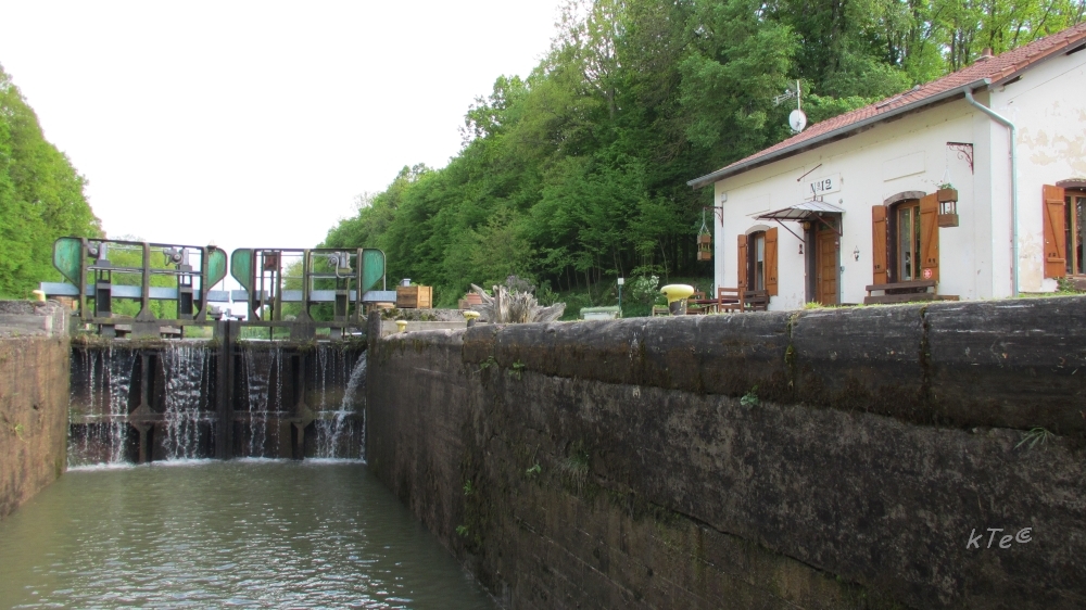 Auf der Gesamtstrecke: Lutzelbourg – Sarralbe und zurück sind 46 Schleusen zu überwinden. Davon die des Sarre-Kanals als Schleusenkette kurz aufeinander folgend, mit einer Fernbedienung, die man an der ersten Schleuse erhält bzw. wieder abzugeben hat. Fast auf der gesamten Strecke folgt ein Treidelpfad dem Kanal, der als Fahrradweg genutzt werden kann, wenn man etwas sportliches unternehmen will. Der Kanal führt durch ein Seengebiet , kleinen Dörfern und den hübschen ehemals Schleusenwärterhäuschen. Der Mai ist die Zeit der Apfelbaumblüte! Übernachtungsmöglichkeiten gibt es überall am Kanal. Man muss nicht unbedingt eine Marina anlaufen. Und zum Einkaufen ist man mit dem Fahrrad schnell in eines der Dörfer entlang des Kanals gefahren. Also frische Brötchen, Croissants und Baguette das muss schon sein. |